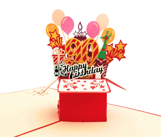Happy 90th Birthday Red Party Box 3D Pop Up Greeting Card