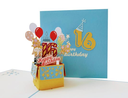 Happy 16th Birthday Blue Party Box 3D Pop Up Greeting Card