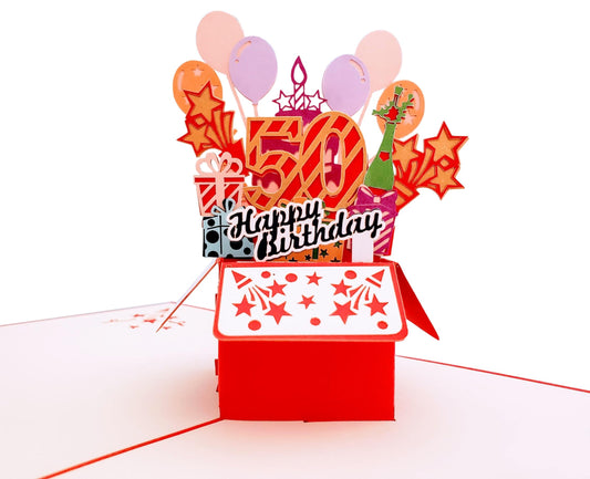 Happy 50th Birthday Red Party Box 3D Pop Up Greeting Card