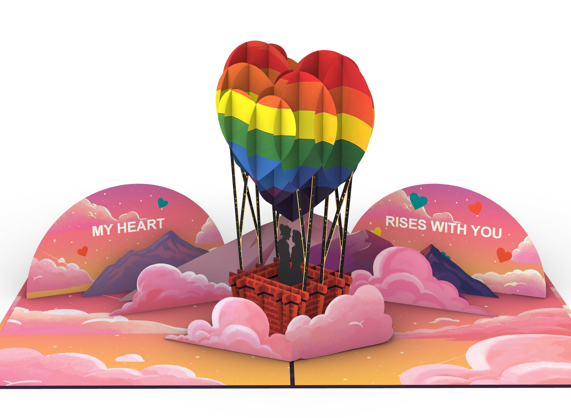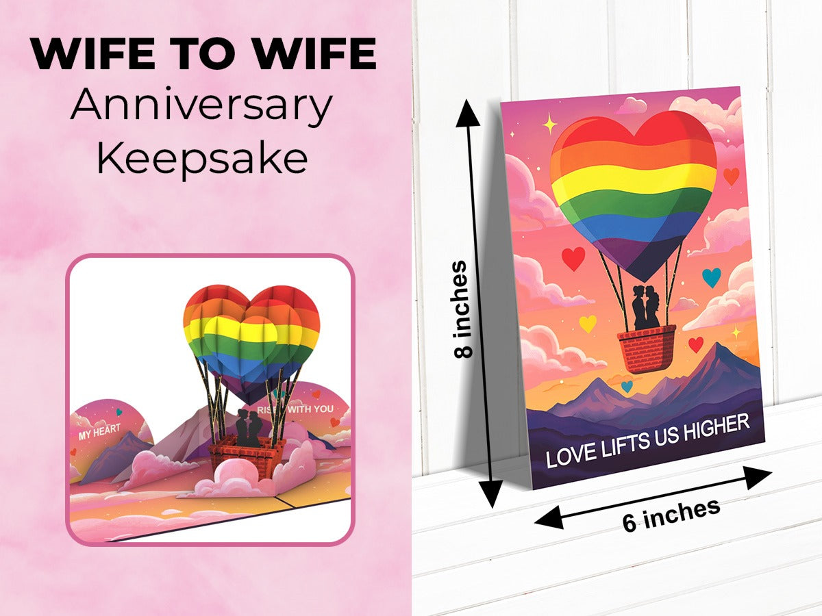 Celebrate love that rises above with this beautifully crafted 3D pop-up greeting card featuring a rainbow heart hot air balloon floating over a dreamy sky. Designed to honor lesbian and LGBTQ+ love stories, this card creates a heartfelt moment the instant it opens.